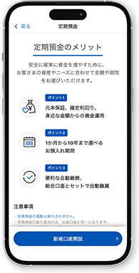 定期預金開設から預入、解約までご自身のタイミングで来店せずにアプリでお手続きができます。